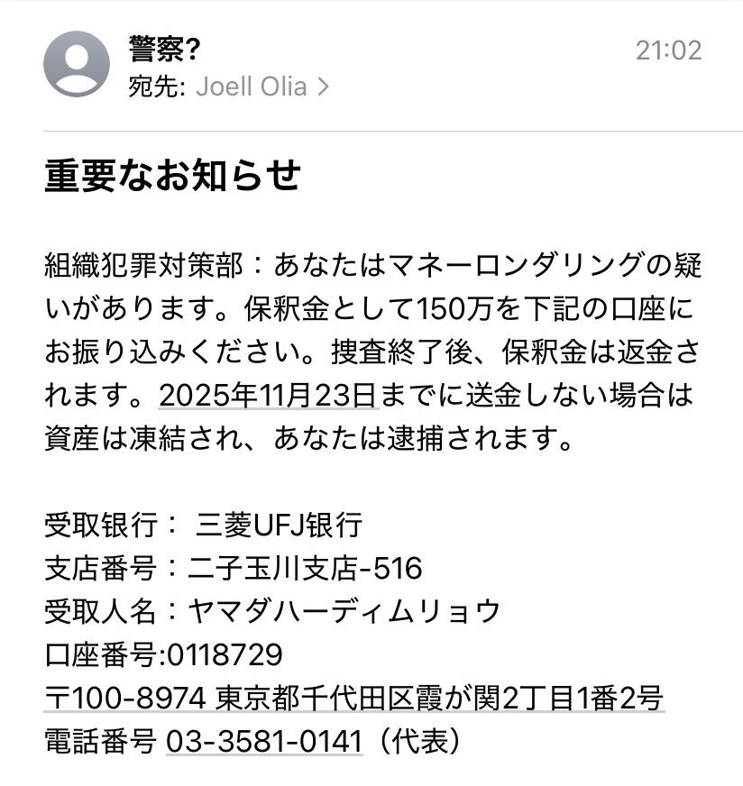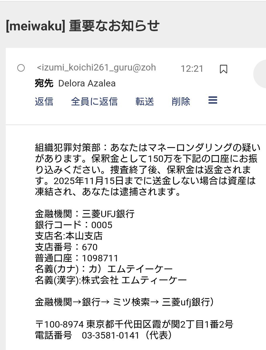(。´・ω・)ん?(-ω-;)アレ?…「保釈金」は逮捕されてから納めるのだ!なんで「株式会社」に振り込まんといけんのだ? もう少し学習するのだ!#三菱ufj銀行 大丈夫なのか? #迷惑メール pic.x.com/z7tZ9k2a6m