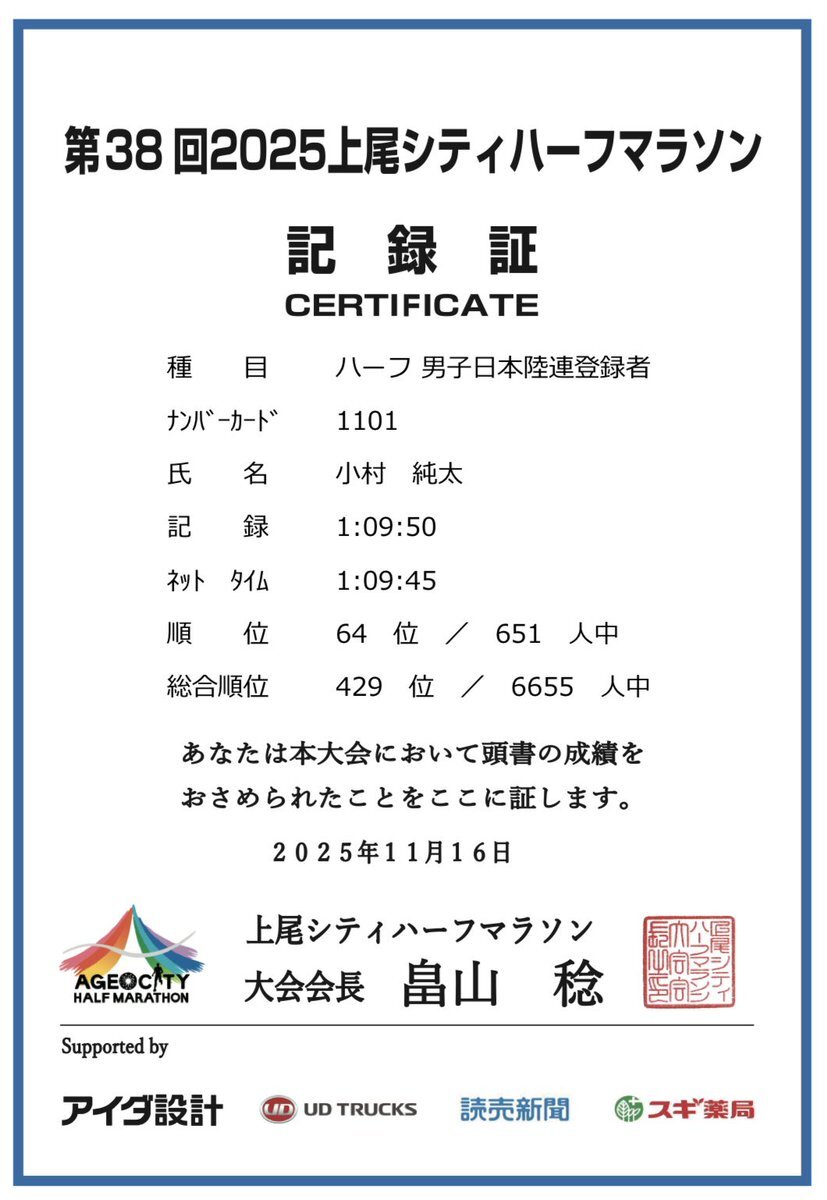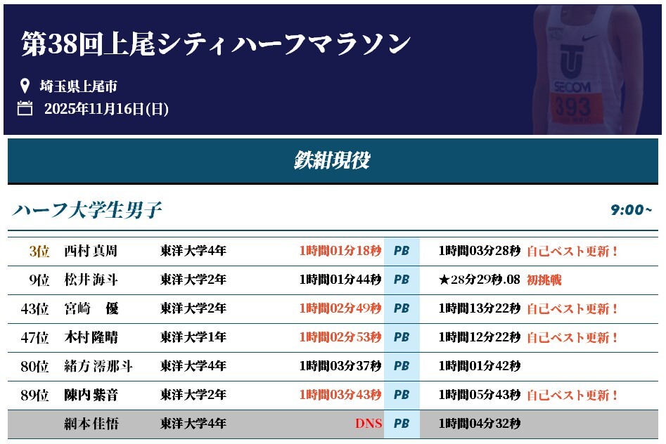 #上尾ハーフ 11/16(in上尾) 【鉄紺勢リザルト🏃♂️】 ★ハーフ大学生男子 ~自己ベスト祭り🎆~ 🥉西村真周(4) 61:18✨ 9.松井海斗(2) 61:44(初) 43.宮崎優(2) 62:49✨ 47.木村隆晴(1) 62:53✨ 80.緒方澪那斗(4)63:37 89.陣内紫音(2) 63:43✨ 網本佳悟(4) DNS tumarkpride.com/race2025/%E7%A… #鉄紺の結束 #鉄紺 pic.x.com/0iybkuDStK