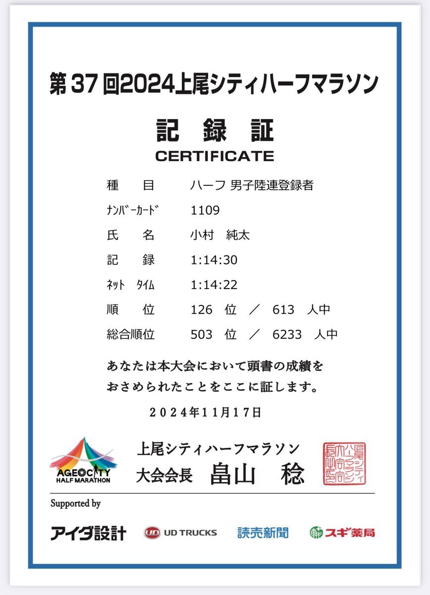 11/16 #上尾ハーフ 1:09'50(PB) 16'13-'37-'53-'38-3'29 Adiospro4 去年の失敗があったのでしっかり寝て当日を迎えることが目標だった今年の上尾ハーフ。 レース補正としか思えないが念願の69分台と今シーズン初PB。 去年と先月のレガシーでの雪辱を果たせて安心した😮💨 #川口市陸協 pic.x.com/xT03Kk62Mn x.com/barrierd_mania…