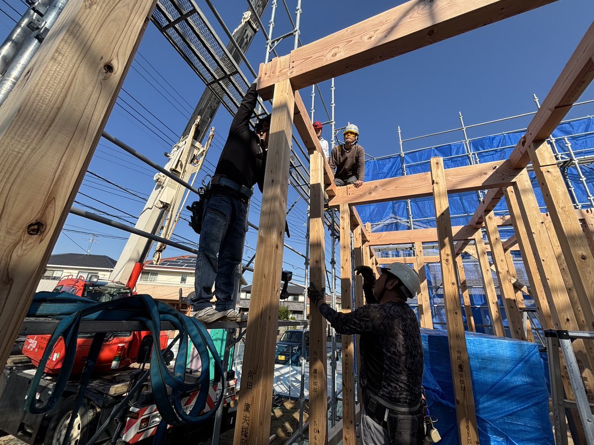 11月7日、立冬の晴天☀️のもと、木更津市にて上棟を迎えました😊 大工さんの手によって、家の形が組み上がっていきます🏠✨️ 感動の上棟式が終わると、いよいよ作業が本格化します。 立冬の寒さに負けず、暖かい家になるよう、完成を楽しみにして下さい😊 #onlyyouhome #注文住宅 #上棟式 #木更津市 pic.x.com/pnzNb8Kui3