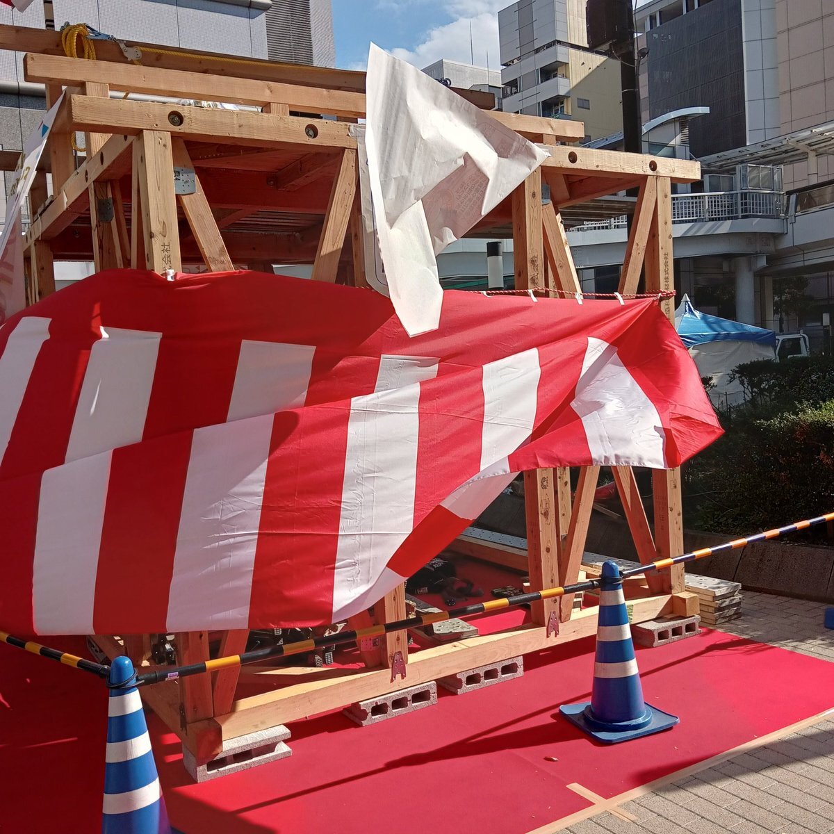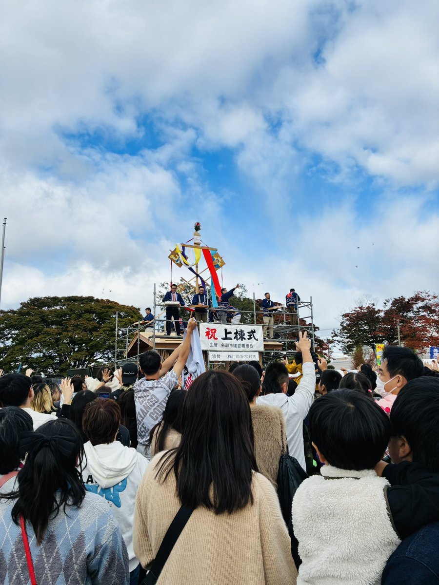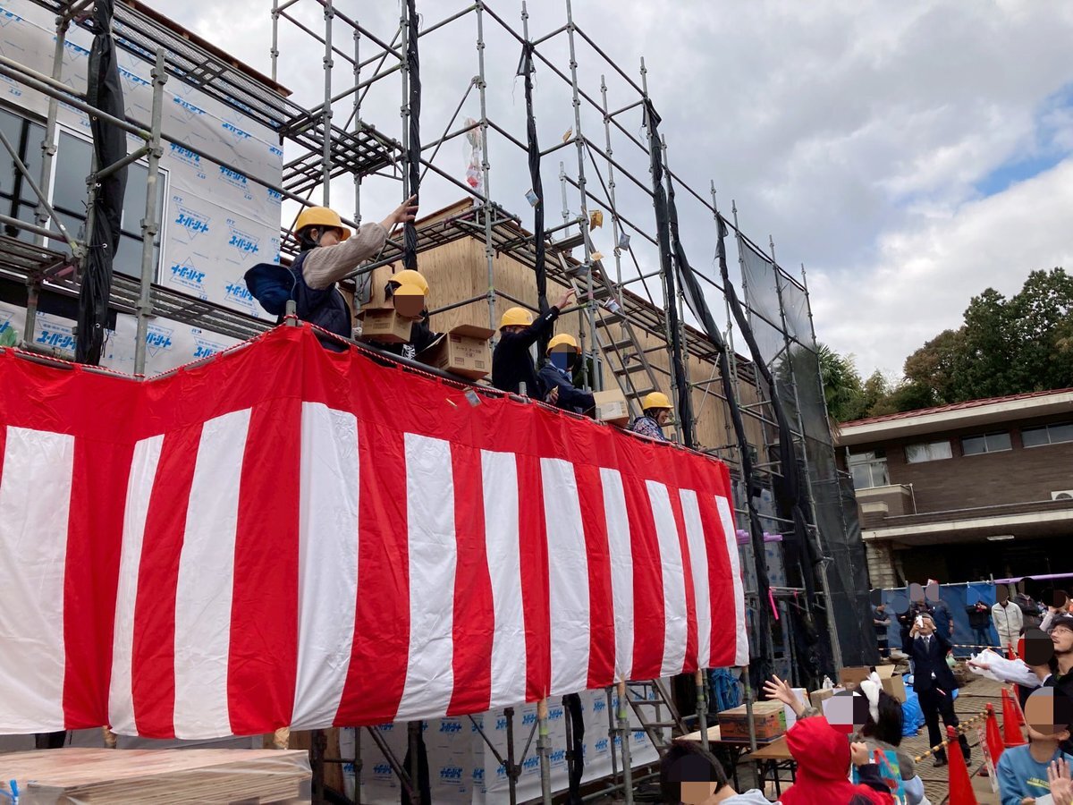 模擬上棟式開始前のひととき これから上棟式でお菓子を撒くのは建物の上棟が無事に終わり魔除けと厄除けの意味が込められている #上棟式 #どけんフェスタ2025 #菓子撒き pic.x.com/iNAr5JgWNI