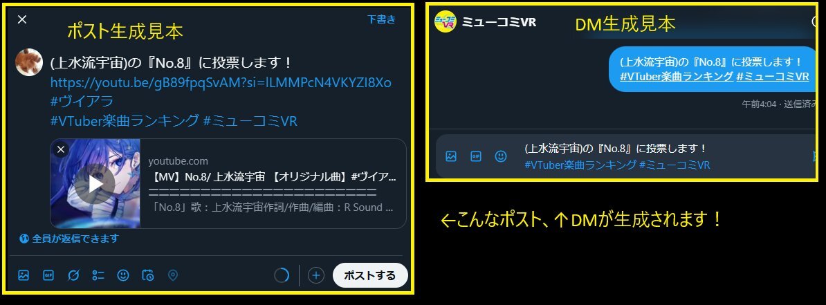 <#VTuber楽曲ランキング 12月23日までの投票用> 上水流宇宙さんの新曲、 5thシングル『No.8』への投票文章を生成できる ポスト&DMリンクです! 投票して新曲を拡散拡散! ご活用ください! ▽ポスト x.com/intent/post?te… ▽DM x.com/messages/compo… youtu.be/gB89fpqSvAM?si… #ヴイアラ