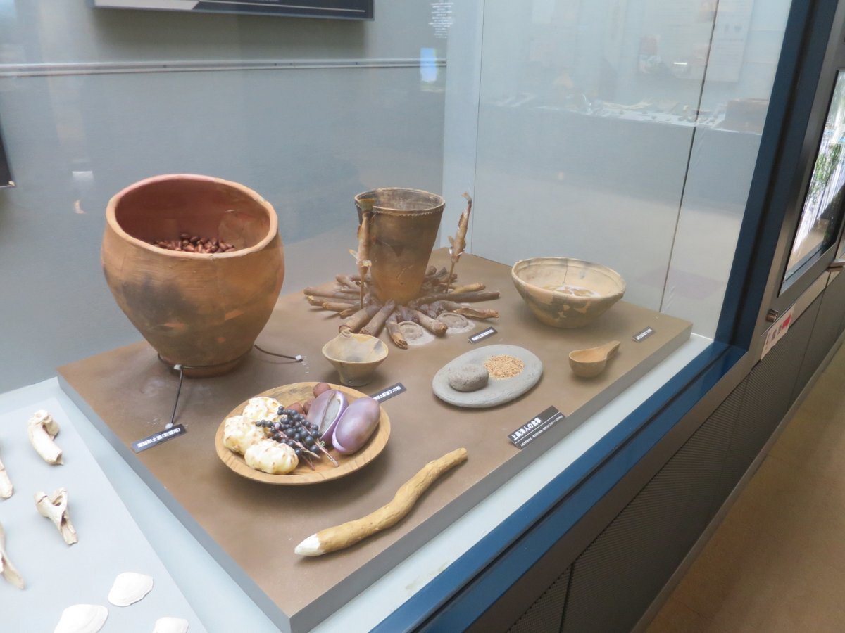 #上高津貝塚ふるさと歴史の広場 #職場体験 3】 #イチ推し展示資料#縄文時代 の上高津人の食事です。今とは全然違います!縄文時代の人は木の実や魚、ドングリも食べていたそう。みなさんもぜひ #上高津貝塚 に行ってみよう! #土浦 pic.x.com/igVeUX7QHv
