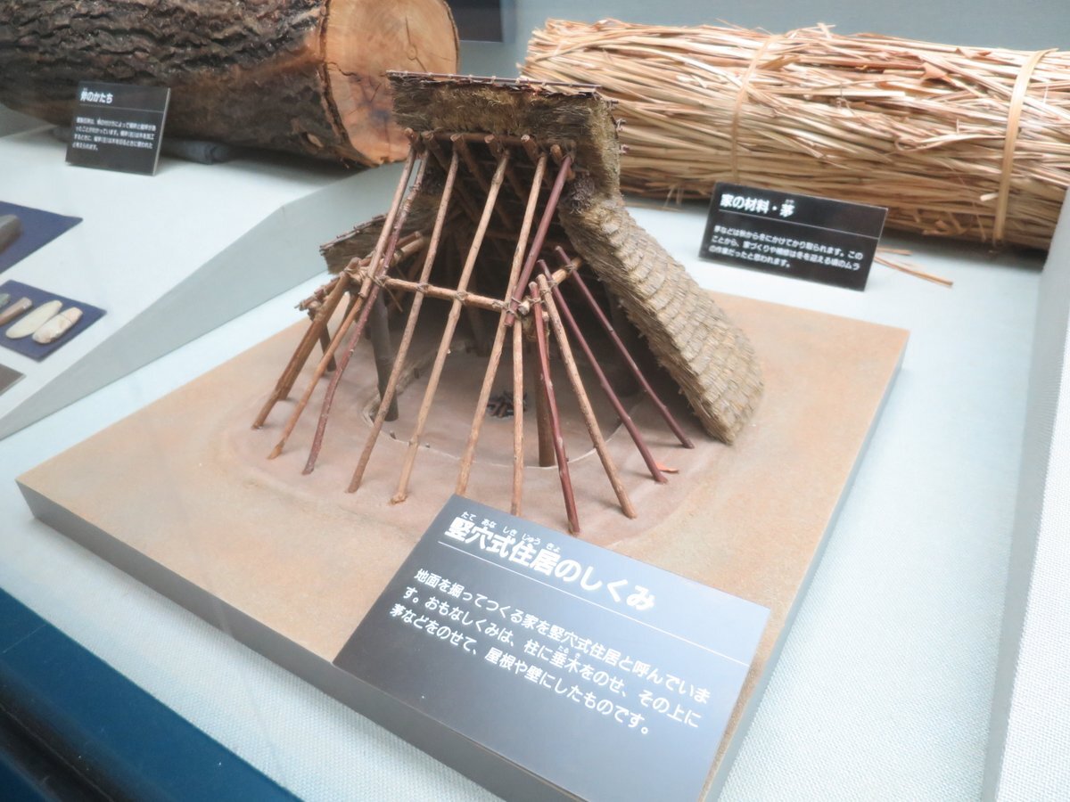 #上高津貝塚ふるさと歴史の広場 #職場体験 2】 #イチ推し展示資料 #竪穴住居 は、穴を掘り、柱・垂木をのせて、壁や屋根となる茅をのせてできる住居で #上高津貝塚 など全国にあります。中は炉や生活に必要な道具があります。この時代から厳しい環境に備える工夫がありました。#土浦 pic.x.com/RDBjVxFrMO
