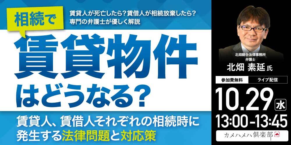 / 10月29日(水)13:00~13:45 ライブ配信 \ 相続で「賃貸物件」はどうなる? 賃貸人、賃借人それぞれの相続時に発生する法律問題と対応策 賃貸人が死亡したら?賃借人が相続放棄したら?専門の弁護士が優しく解説 ↓詳細はこちら↓ kamehameha.jp/newseminar?id=… #不動産の相続 #賃借人死亡 pic.x.com/V24GBqMxDs