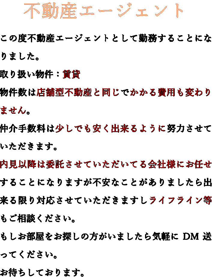 友人が不動産賃貸仲介のエージェントを始めました。 都内をメインで活動し、家賃次第であるものの仲介手数料MAX2万円とのことです。初期費用を抑えたい方など、ご興味ある方はぜひご連絡ください。 #不動産エージェント #引っ越し #初期費用節約
