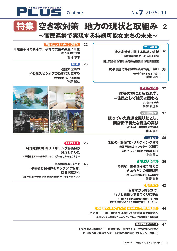 月刊誌『不動産コンサルティングプラス』第7号、11月1日発行! 特集『空き家対策 地方の現状と取組み』ほか ▼購読申込は大成出版社サイトより taisei-shuppan.co.jp/show/detail.ht… #不動産情報 #不動産コンサルティング pic.x.com/QR3roP2Ph0