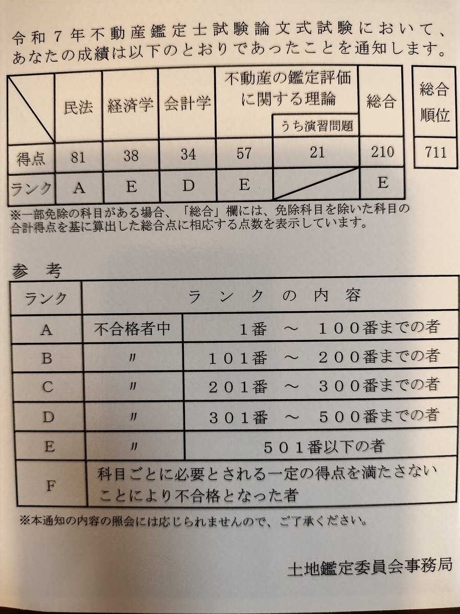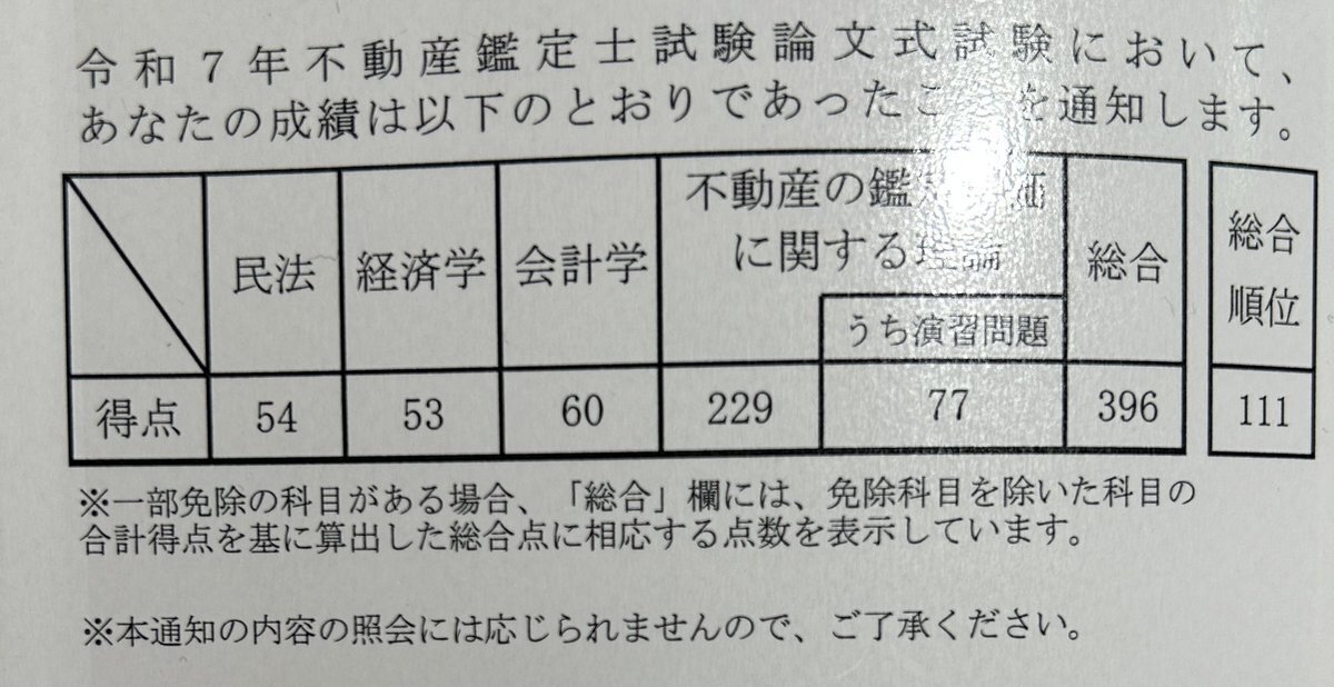 不動産鑑定士試験論文式試験の結果が返って来ました。鑑定理論がまさかの50点台。基準の制度が甘いのか。演習は半分も埋めれていないから納得。民法は10時間しか勉強していないが、この点数。やはり事実と条文に点が振られていることを確信。鑑定理論と経済学何とかすれば、合格だ!! #不動産鑑定士 pic.x.com/m1o3iqLGT6