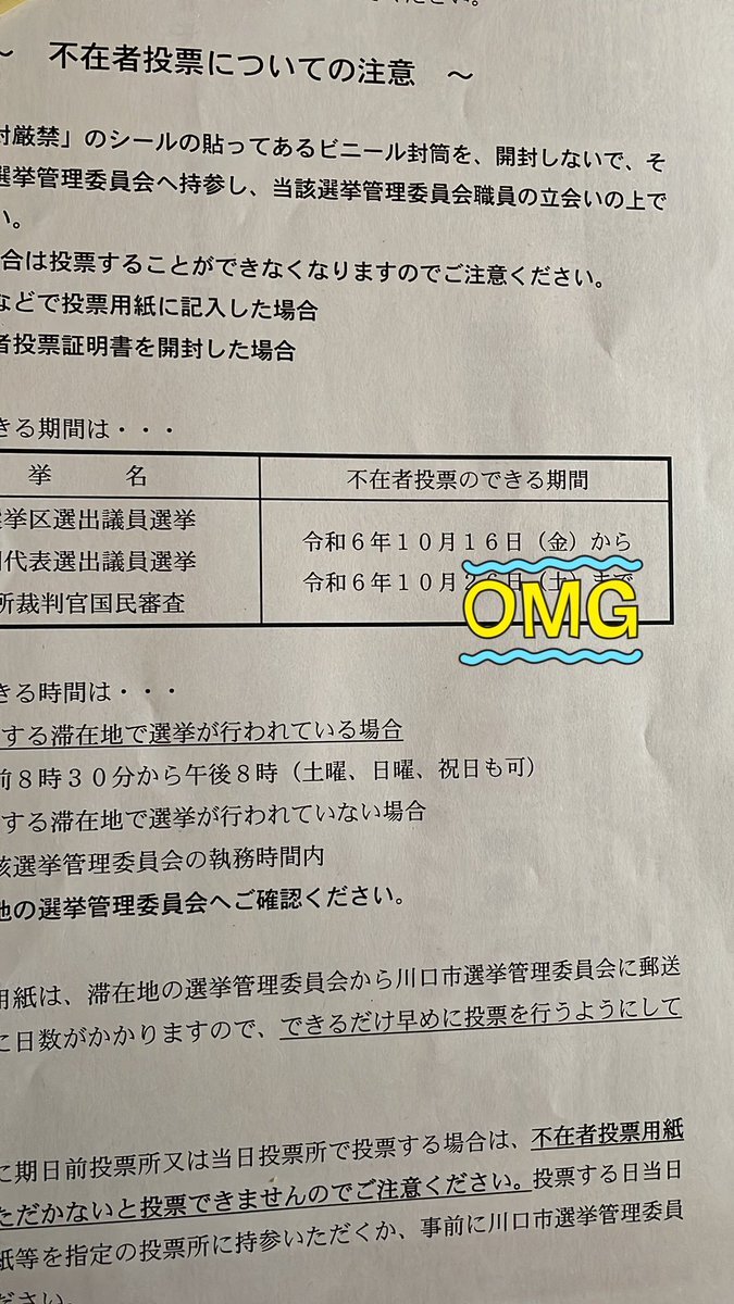川口市民で不在者投票を予定している皆様!日付と曜日が一致してないけれども、16日水曜日からですのでもう投票出来ます!! #衆議院議員総選挙2024 #不在者投票 #埼玉3区 #陣痛待ち pic.x.com/SleDiQZ7Xp
