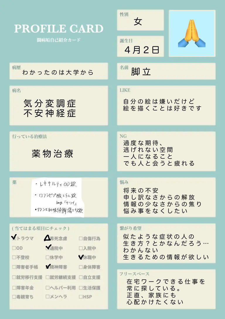 ゆっくり生きていこうと思っています。 頭をまとめるために暗いツイートしてしまったり、他を♡やrtしてったりします。 #気分変調症 #不安神経症 #闘病垢さんと繋がりたい #闘病垢自己紹介カード #精神疾患を持つ人と繋がりたい #精神疾患持ちのための自己紹介カード pic.x.com/F1PNvM8AFf