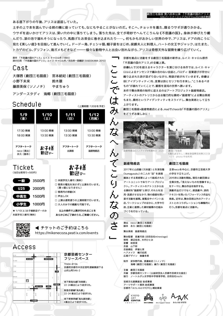 【どの日にしますか】チケット発売中 《アフタートーク詳細》 1/9(金)…neco(演出)・永久(脚本) 10(土)…なし 11(日)…出演者 12(月祝)…副産物産店 KACパートナーシッププログラム2025採択事業 #劇団三毛猫座 第八回本公演 『 #不思議の国のアリス 』 ご予約 mikenecoza.peatix.com/events pic.x.com/R8K898anRf