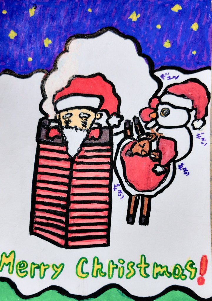 こちらの作品もクリスマスコレクションの不採用イラストでサンタクロースが、煙突からプレゼントを渡しに行こうとしたら、袋が大きすぎて煙突に引っかかってしまったのを雪だるまとトナカイが手伝って煙突に袋を押し込む絵です #クリスマス #ポストカード #不採用 pic.x.com/BZZV2ZOpq3
