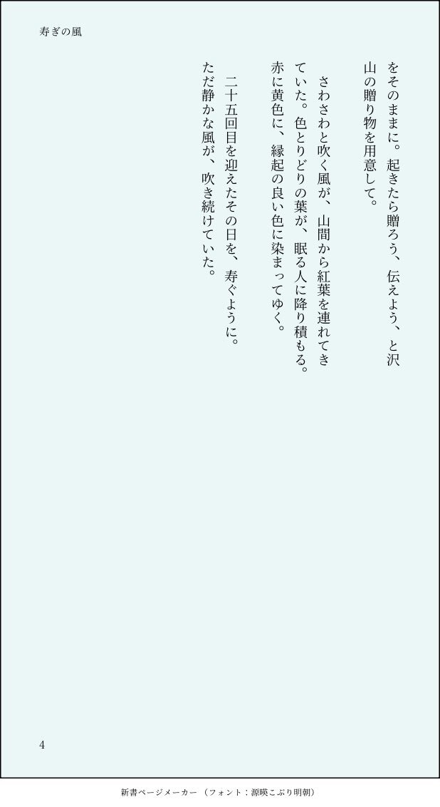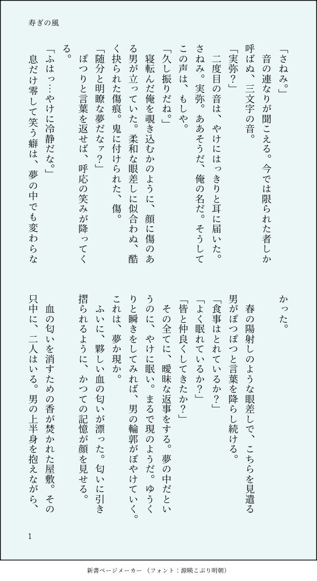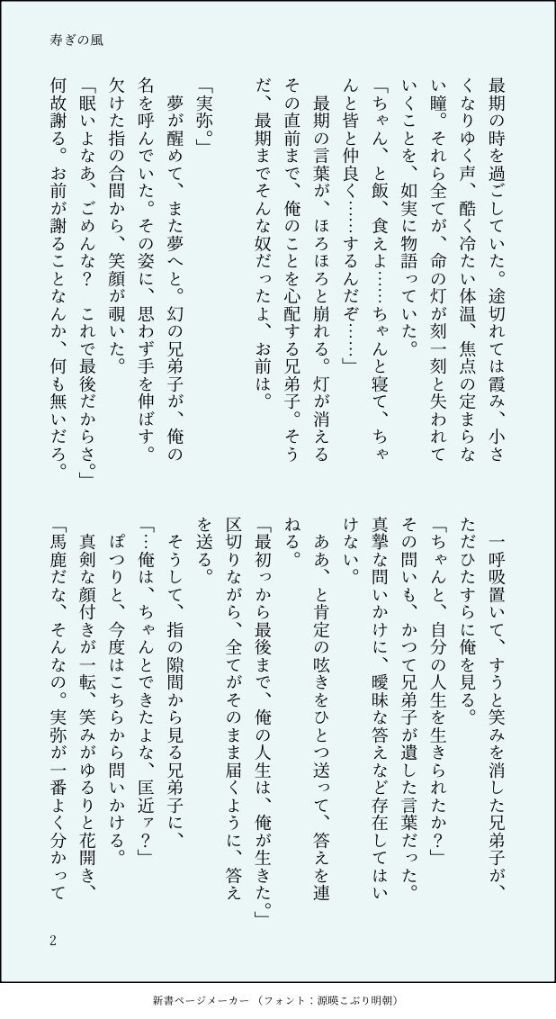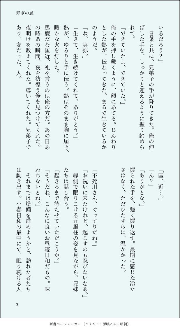 不死川実弥さん、お誕生日おめでとうございます。今日この日が、佳き日でありますように。 最終決戦後、短い余生を過ごす不死川さんと、そこに訪れたかつての兄弟子であり友だった粂野匡近の話。 #不死川実弥誕生祭2025 #不死川実弥生誕祭2025 ※画像変換した小説です、ALTに全文記載しています。 pic.x.com/bowLZQCn2K
