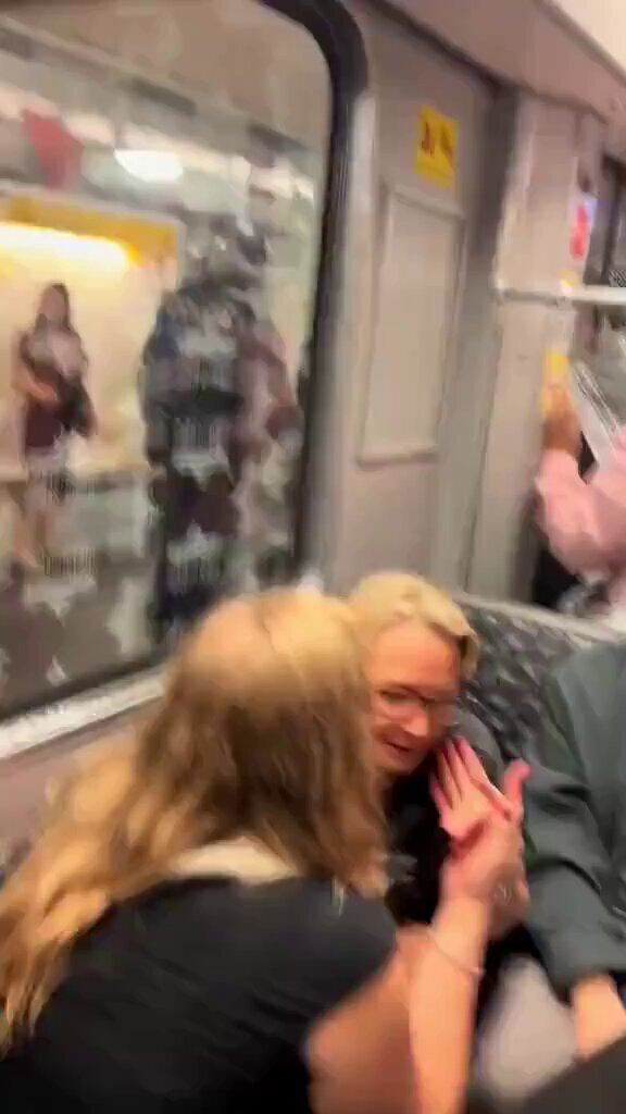 ドイツ・ベルリンの地下鉄の車両内、ドイツ人女性たちがパレスチナの旗を持ったイスラム系移民に囲まれている。泣きながら恐怖に震える様子の絵。怖っ!