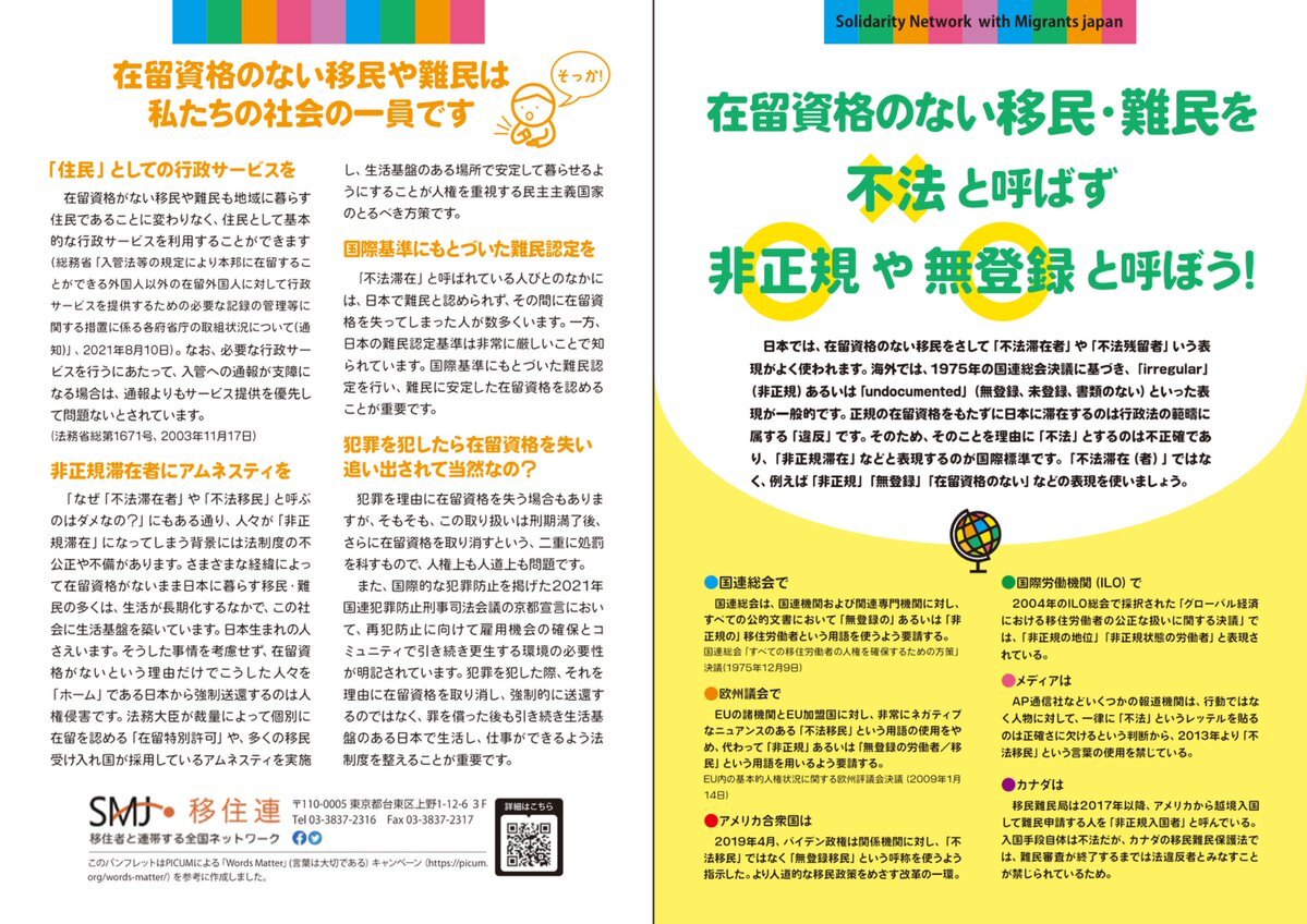 参考資料: [在留資格のない移民・難民を不法と呼ばず非正規や無登録と呼ぼう!](migrants.jp/news/others/23…)