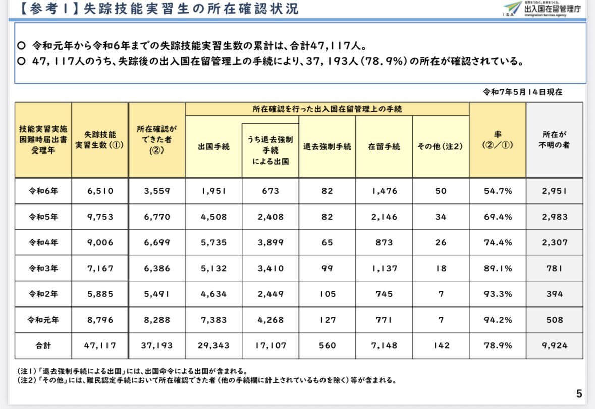 #技能実習制度廃止 令和元年から令和6年までの失踪技能実習生数の累計は、合計47,117人。 47,117人のうち37,193人は所在が確認されているが、1万人近くが所在不明 #不法滞在者強制送還 #アフリカホームタウン計画の白紙撤回を求めます pic.x.com/FTua6tHCs8 x.com/yuyawatase/sta…
