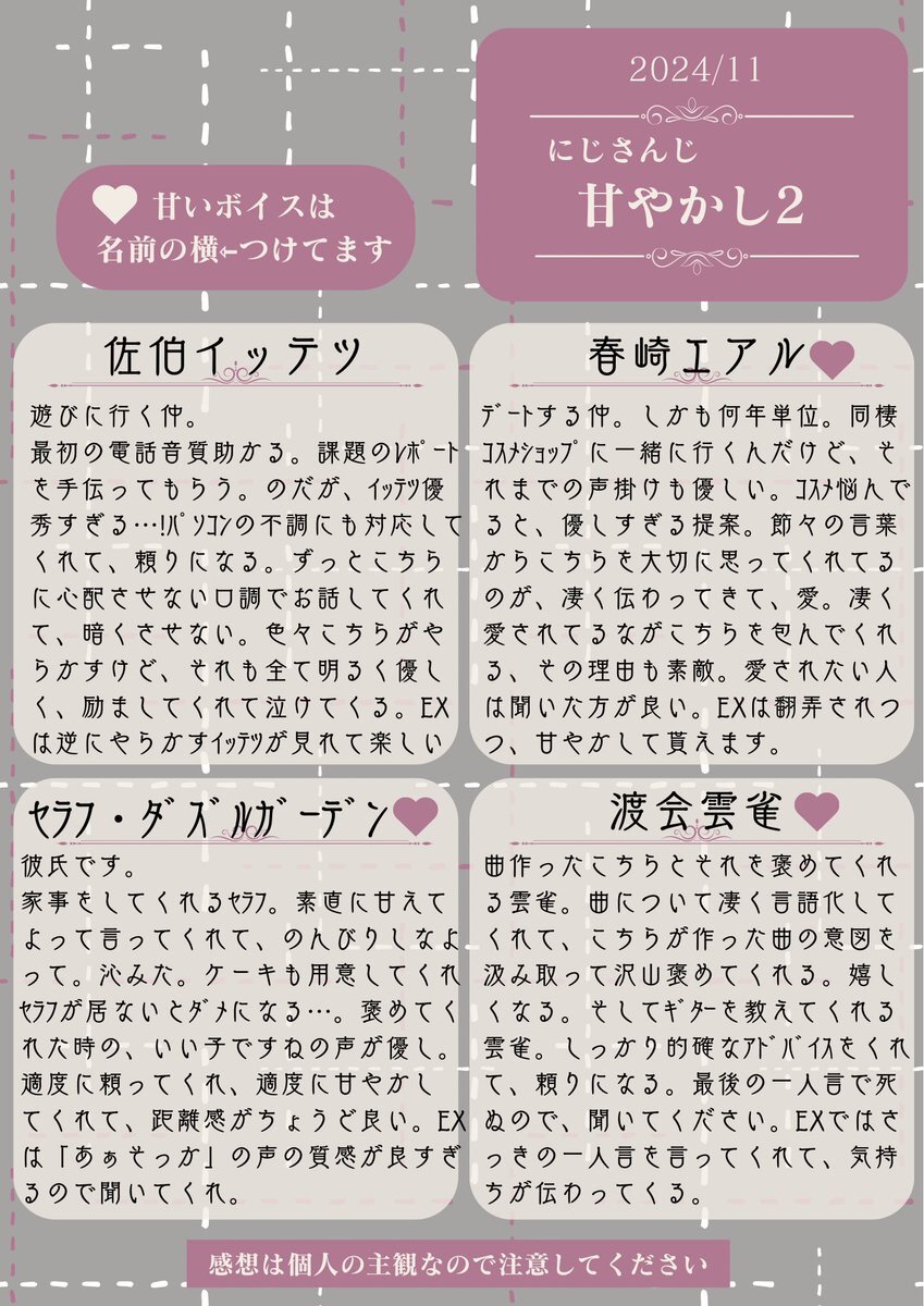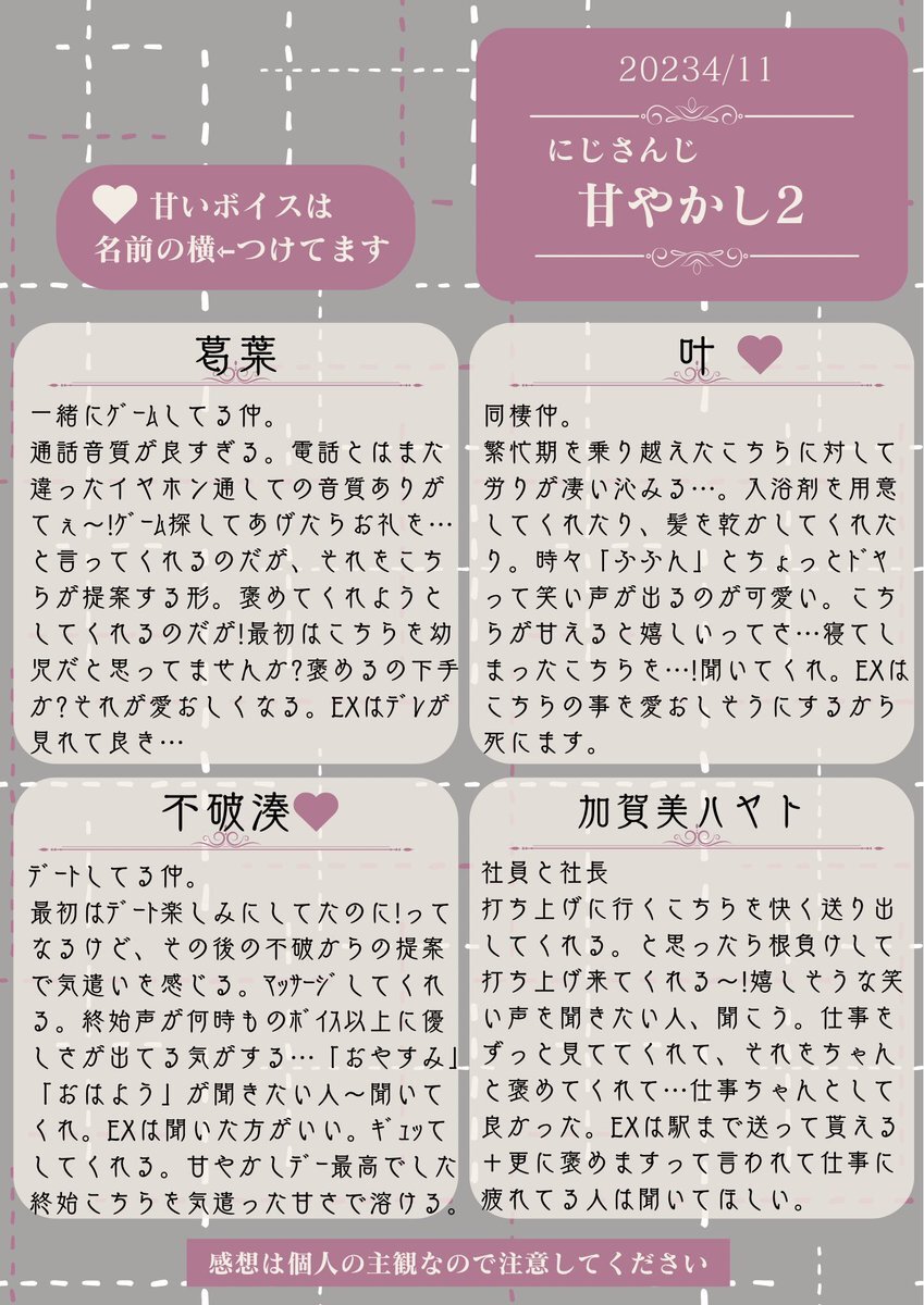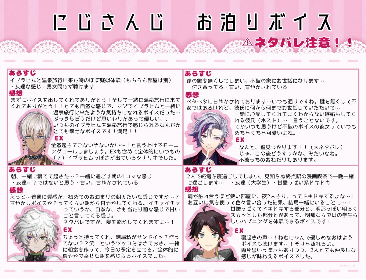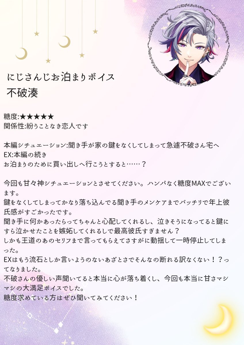にじさんじお泊まりボイス 感想シート 不破湊 ⚠︎微ネタバレあり 今回も今回とてあまあまでございます ここ最近不破さん不足で嘆いているリスナーさんはぜひこれを聞いて癒されましょう #にじさんじお泊まりボイス #不破不破ボイス pic.x.com/g8OdSh5LlP