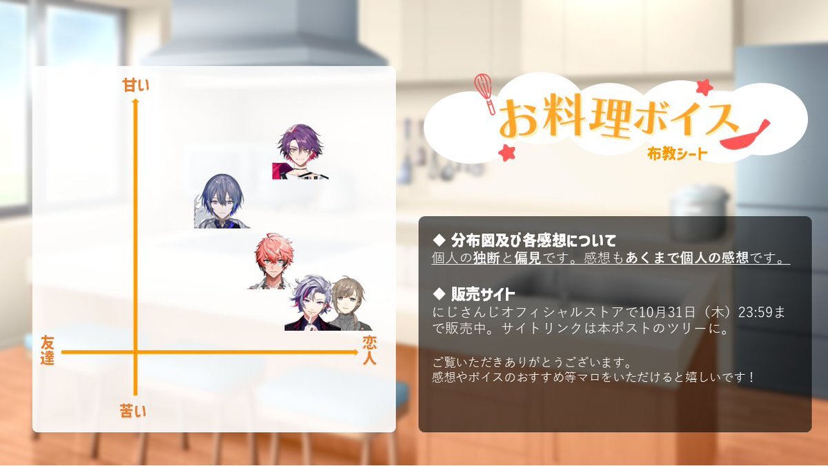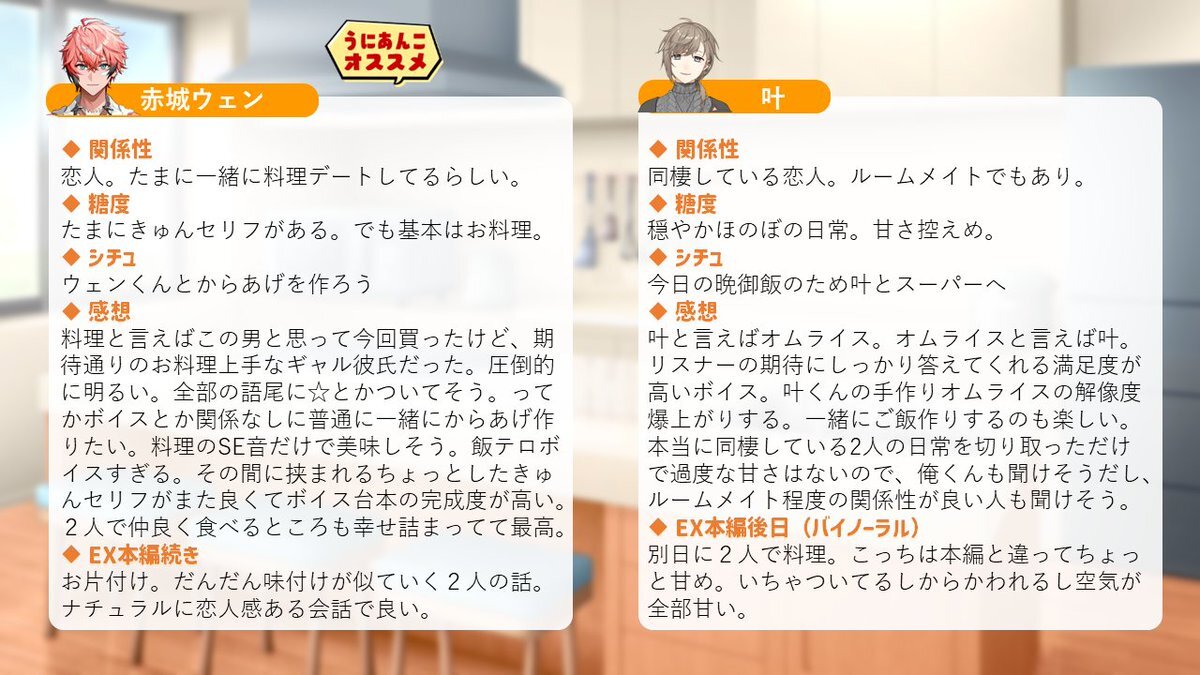 にじさんじお料理ボイス 布教シート 全体的にほのぼのした感じで癒された~。ウェンくんの唐揚げ食べたすぎる深夜に聞くと死ぬ飯テロボイスでした。 渡会くんは少女漫画でした! #にじさんじお料理ボイス #ウェンの耳レポ #叶のボイスメモ #ロウの遠吠え #不破不破ボイス #渡会盗聴会 pic.x.com/jMjXyrjCbO