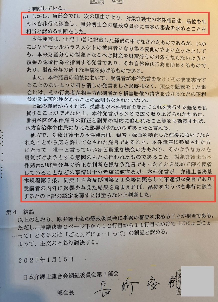 詳報‼️ #世田谷離婚講座問題 【日弁連決定書の内容】 ○懲戒対象弁護士の発言は、品位を失うべき非行に該当 ○弁護士職務基本規定第5(信義誠実)、14(違法行為の助長)、21条(正当な利益の実現)等に照らして不適切 pic.x.com/TI9SkP4CJ3