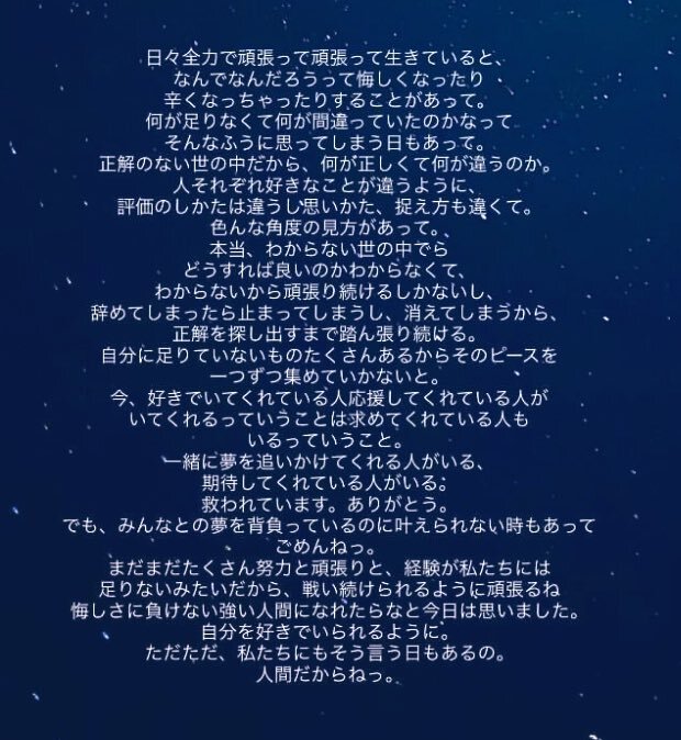 10年間走り続けた、これからも信じて走り続ければきっと叶うと信じて、今度は走るの辞めて、前を向いて、頭を上げて、青い空へ飛んで行こう、ずっとずっと高い所までみんなで飛んで行こう。大丈夫必ずてっぺんまで行けるはず。だって #世界でいちばんアイドル だから。 #坂井仁香 pic.x.com/TxULamU9wb
