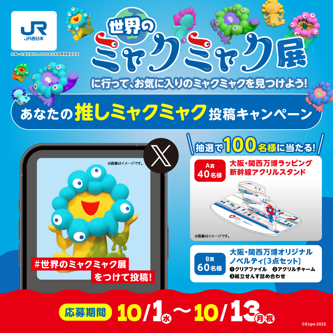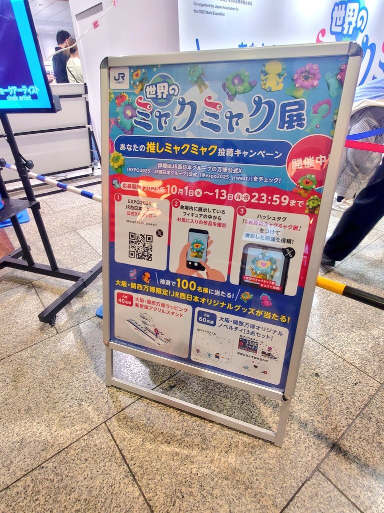 イベント開催中📢 【10/1-9 10:00~19:00 大阪駅旅立ちの広場】 ※上記時間以外はパーテーションの外からご覧いただけます 【10/12-13 大阪・関西万博会場内 ギャラリー WEST】 / 会場で「推しミャクミャク」の写真を撮って投稿すると 抽選でオリジナルノベルティが当たる! \