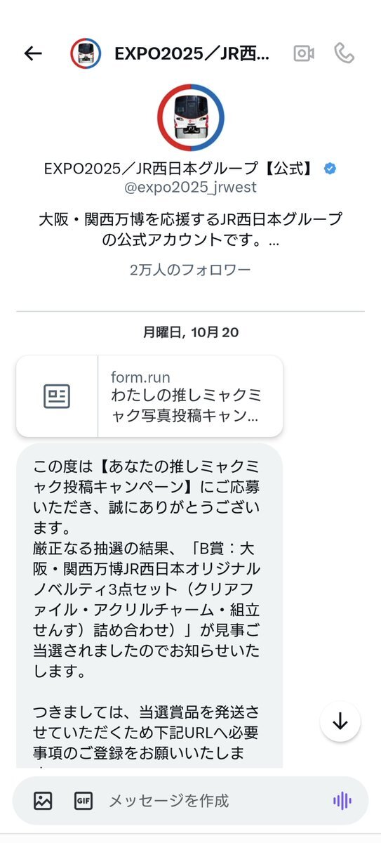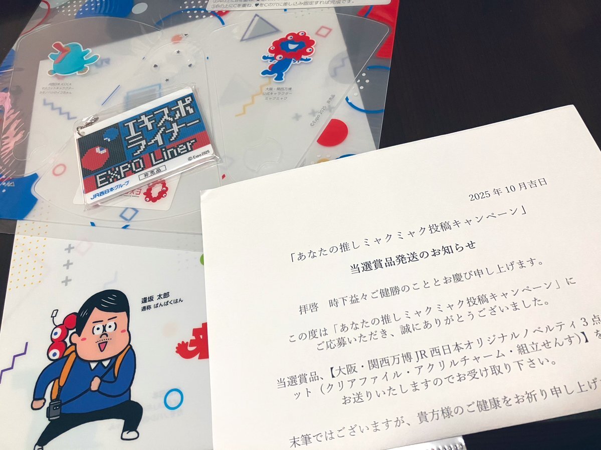 こちらのキャンペーンに当選して、先日賞品を受け取りました!当選DM来た時のインプレッションはまさかの「2」😂 エキスポライナーのキーホルダー嬉しいな♪ありがとう😆 @expo2025_jrwest #世界のミャクミャク展 #expo2025 pic.x.com/069h3BGHdl x.com/gummy_kammy2/s…