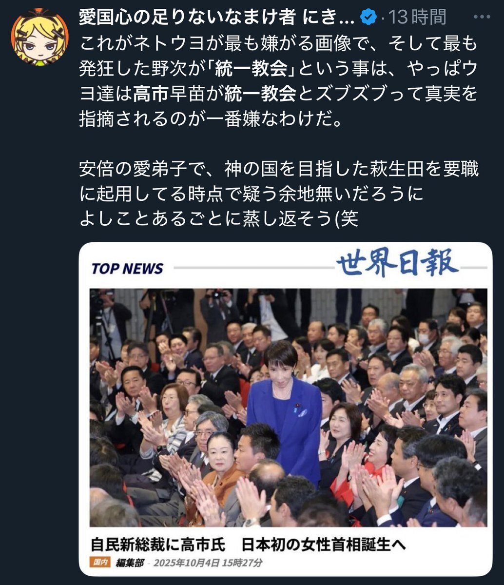 返信先:@ruukundaまあまあまあ。 落ち着いて。 もう、文が鮮明すぎる。 #世界日報は統一教会の広報 #自民党は統一教会 #自民党が滅びなければ日本が滅ぶ #自民党は解党一択 #裏切りの萩生田 #裏切りの萩ユダ #高市やめろ #アメリカ産米輸入拡大 #クラウドワークス pic.x.com/aJZo44yMfj