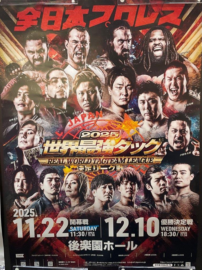11・22(土)11時30分 全日本プロレス 世界最強タッグ決定リーグ戦2025~開幕戦~ 後楽園ホール A指定席は売切れ B指定席 4,000円→3,200円 t-1.jp/tk/fighting/63… #ajpw #全日本プロレス #世界最強タッグ決定リーグ戦2025 #プロレス 12・10、12・31発売中