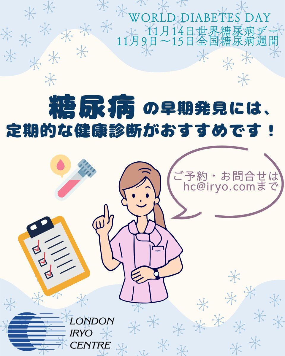 11月14日は #世界糖尿病デー、11月9日~15日は #全国糖尿病週間 でした。初期には自覚症状がほとんどない場合も多い糖尿病。早期発見のために定期的な健康診断を受診しましょう。ご予約・お問合せはhc@iryo.comまで✉ iryo.com/practice/healt… #ロンドン pic.x.com/Sa0RGw0rbv