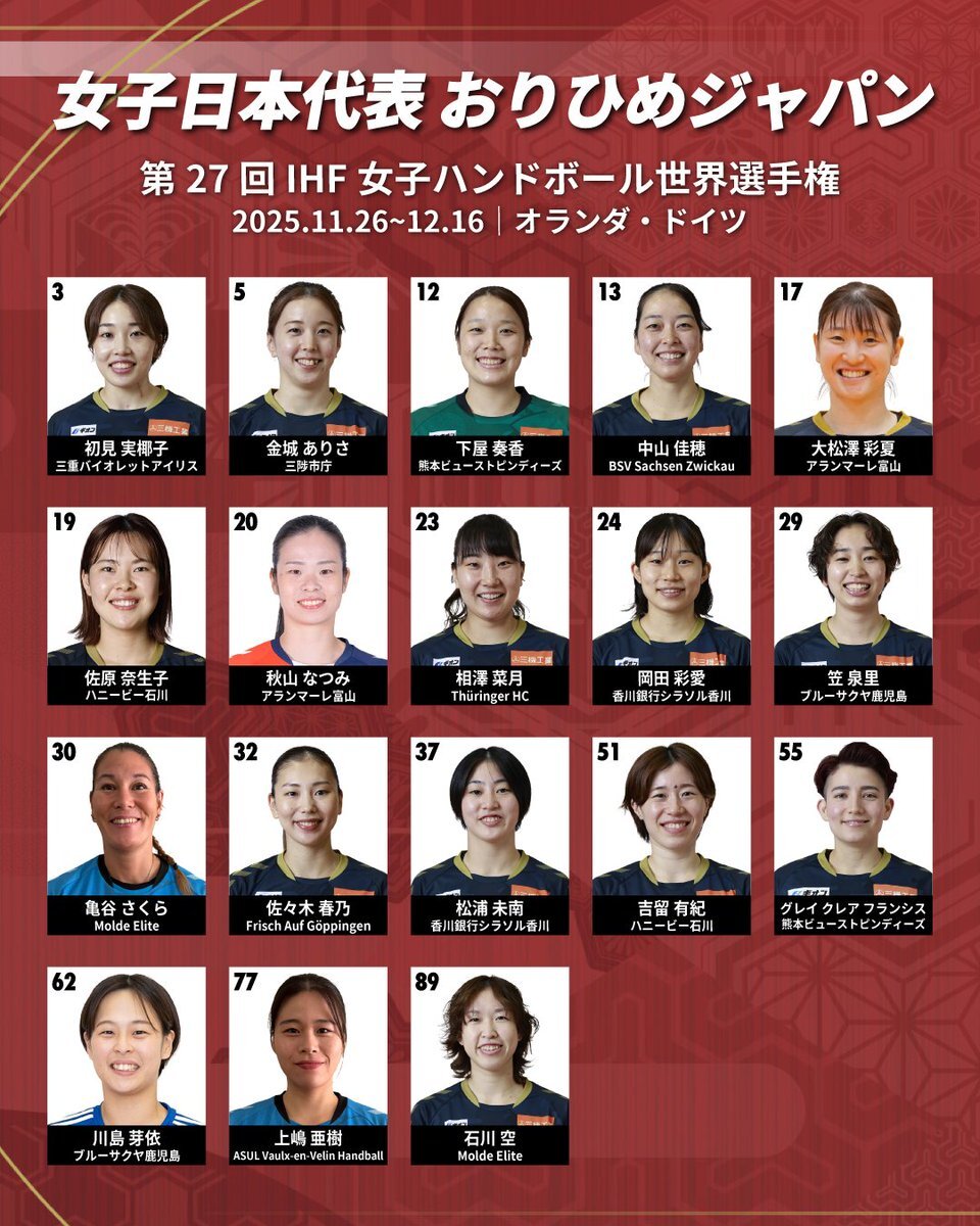 🇯🇵#おりひめジャパン🇯🇵 「第27回IHF女子世界選手権」に出場する女子日本代表メンバーをお知らせします📝 📅11/26(水)~12/16(火) 📍オランダ・ドイツ 詳細はこちら🔽 prtimes.jp/main/html/rd/p… #ハンドボール日本代表