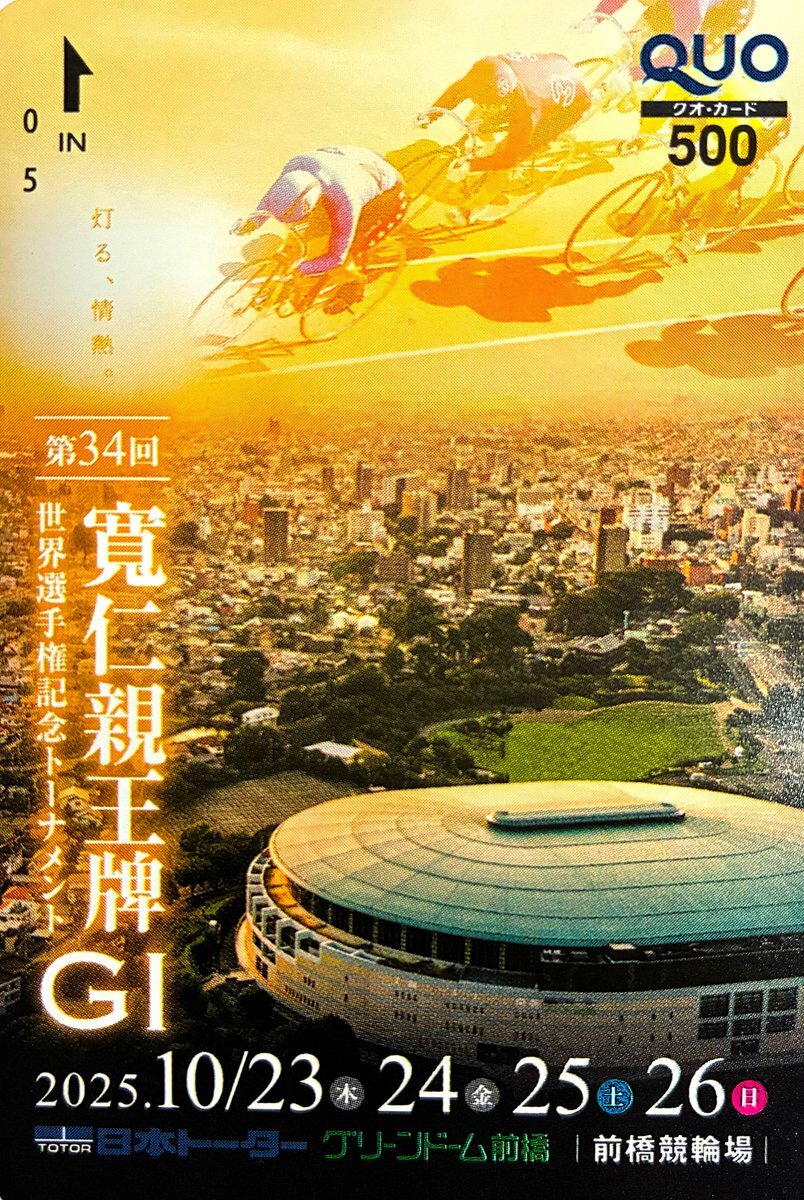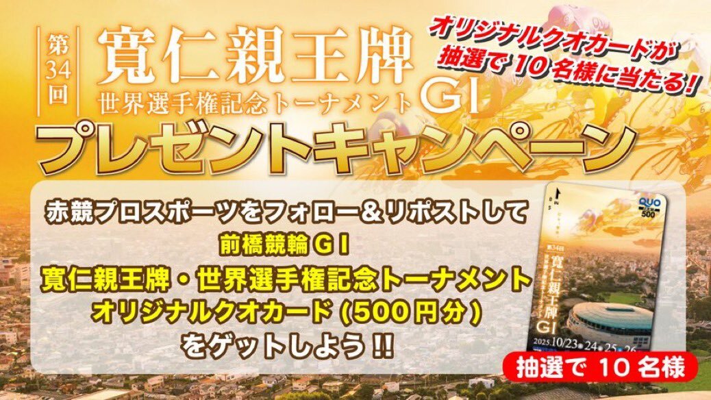 #前橋競輪 GⅠ 「 #寬仁親王牌 オリジナルQUOカード」を抽選で10名様に プレゼント! ▼応募方法 ①このアカウントをフォロー ②本ポストをリポスト 締切:10/26(日)16:30まで 当選者にはDMで連絡します。 yen-joy.net