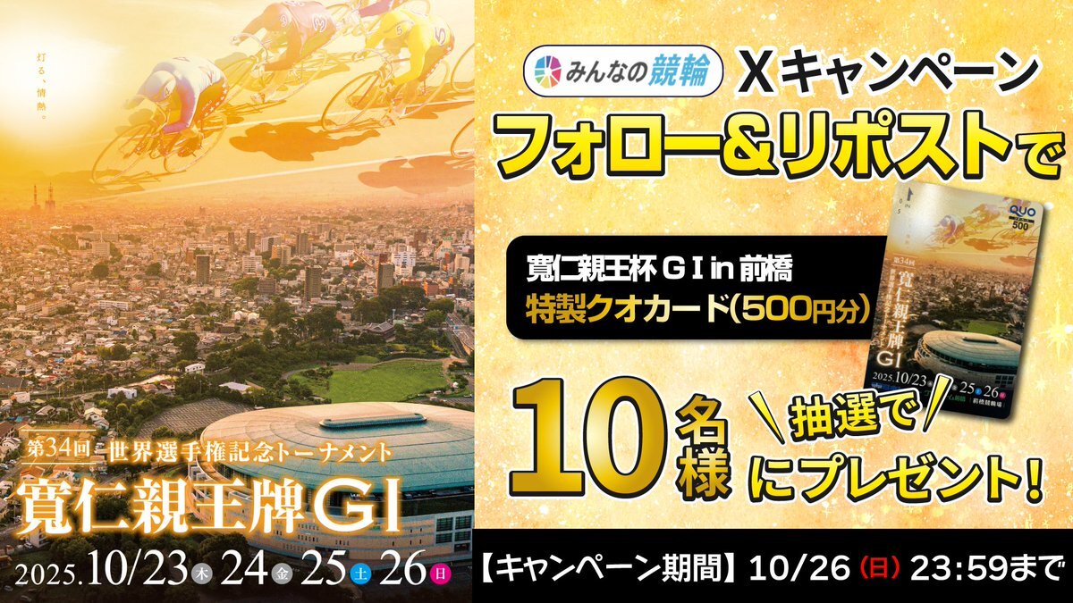 🚴『寛仁親王牌G1』PRキャンペーン🚴 10/23(木)~10/26(日)、#前橋競輪場 を舞台に開催✨ フォロー&RPで、抽選で10名様に特製クオカードが当たる! 1⃣応募方法 @minnano_keirin をフォロー 2⃣投稿RP(10/26 23:59〆) 「#みんなの競輪」新規入会CP⇒minnano-keirin.com/announcement/2…
