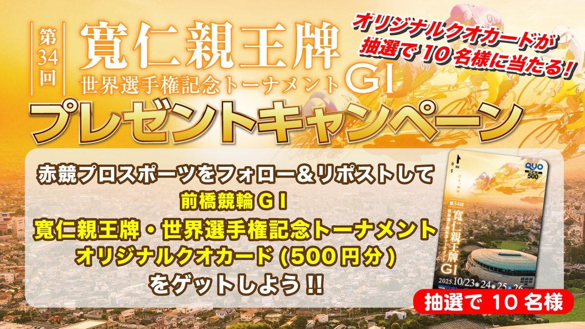 #前橋競輪 「第34回寬仁親王牌・世界選手権記念トーナメント」フォロー&リポストキャンペーン🌟 開催を記念して前橋競輪オリジナルクオカードを10名様にプレゼント! 応募方法🎯 ①@tkmt_keirin フォロー ②この投稿をRP(10/27 8:00〆) ※当選者の方にはDMにてご連絡いたします #高松けいりん