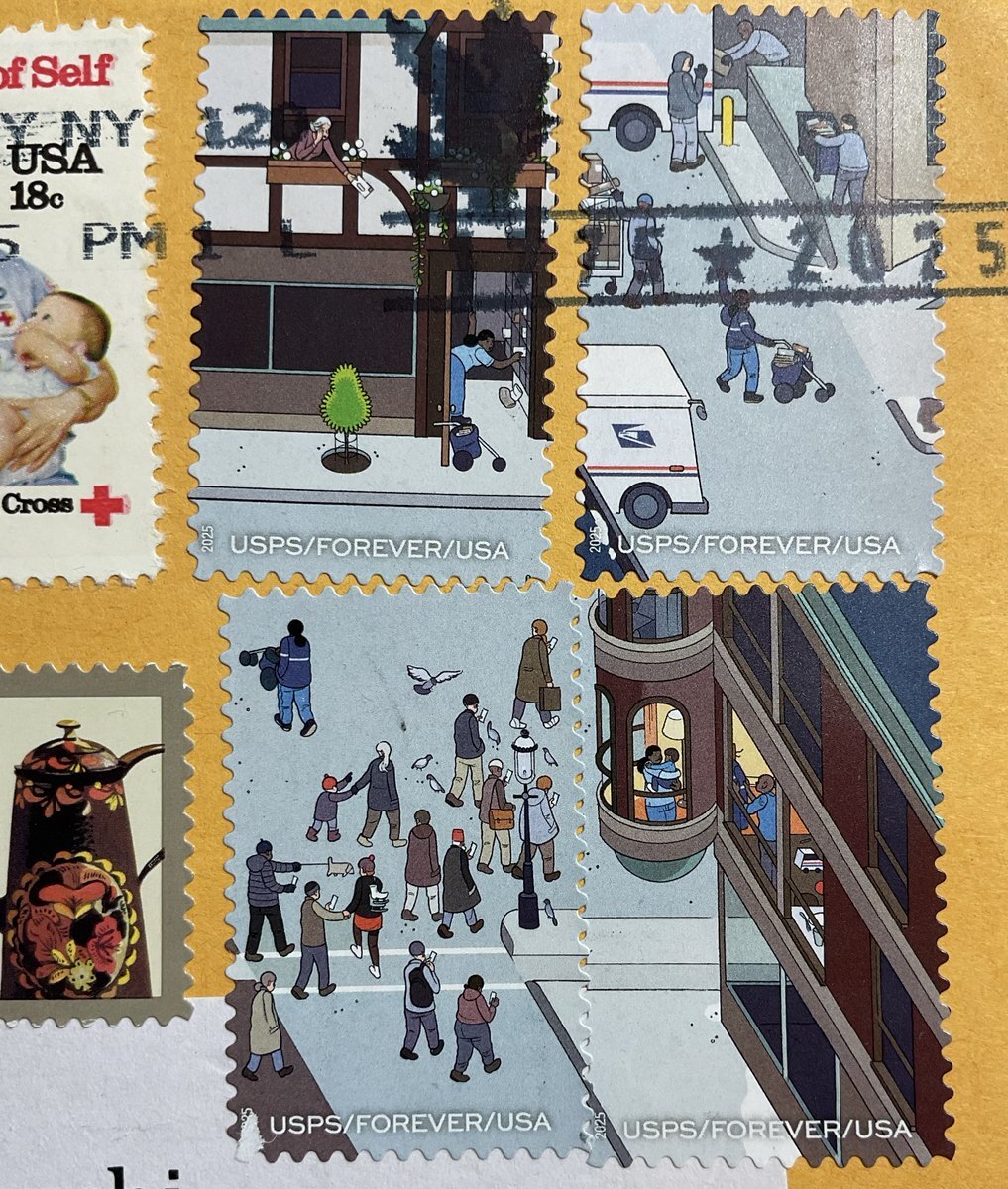 本日は #世界郵便の日 #世界郵便デー タイミングよくアメリカから米国郵政公社(USPS)設立250周年を記念する切手の貼られた手紙が届きました。洗練されたイラストの中に郵便配達のトラックが見えます。アメリカでは独立戦争の始まった年(1775年)から郵便事業は始まっていたのですね。 pic.x.com/buvhlklFqq