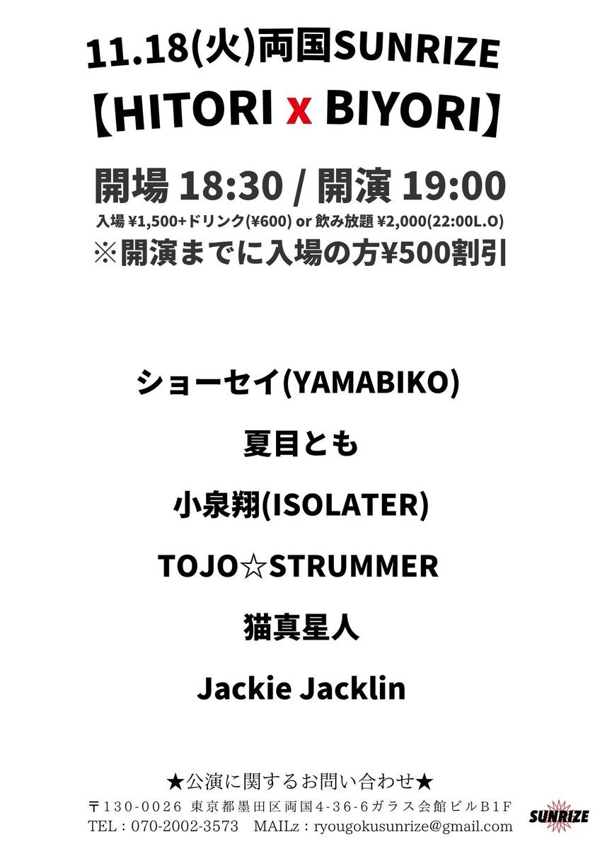 #猫真星人 ライブ情報です‼️ 猫真は21:00〜 #弾き語り します お待ちしてます🐈⬛🐈 11/18(火)両国SUNRIZE 【HITORI x BIYORI】 開場 18:30 / 開演 19:00 入場 ¥1,500+ドリンク(¥600) or 飲み放題 ¥2,000(22:00L.O) ※開演までに入場の方¥500割引 livehousesunrize.jp/events/33590