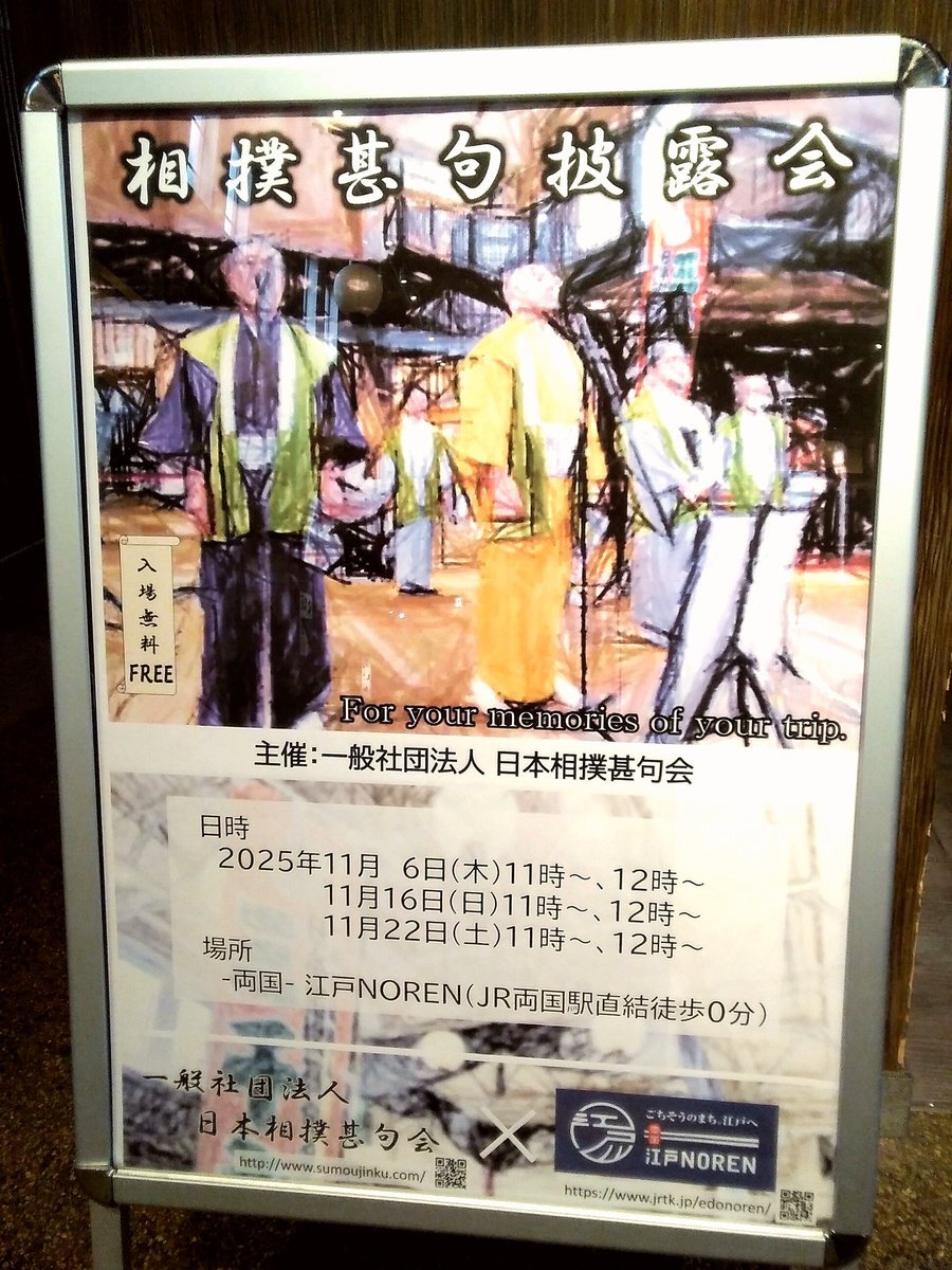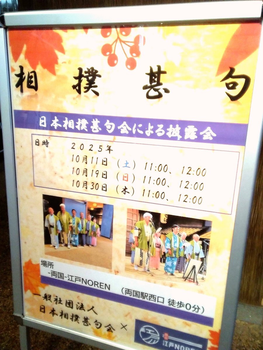 本日は甚句披露会さんによる、甚句が披露されております。素敵な歌声をお楽しみください(^-^)/ 今月の予定は 11月6日(木)、16日(日)、22日(土)の3回 11:00~、12:00~の各30分間の開催です🎶 お楽しみに🤗 #相撲甚句 #甚句披露会 #江戸のれん #両国観光案内所 pic.x.com/tHDv36Cws1