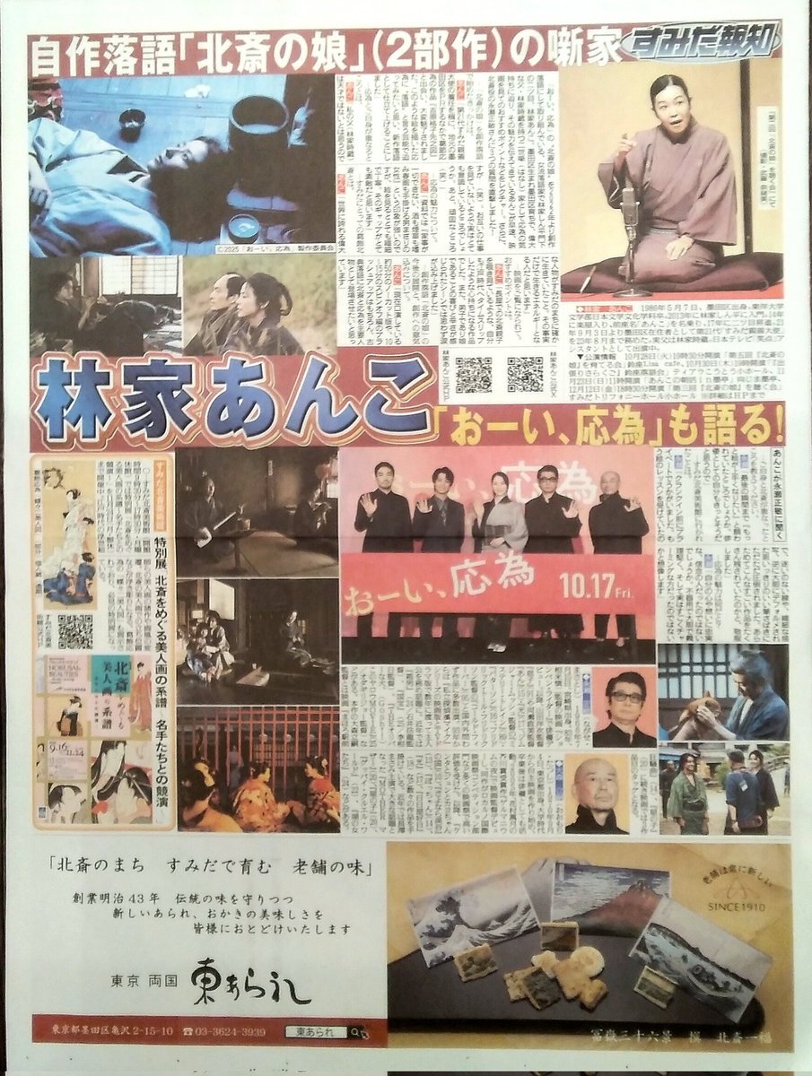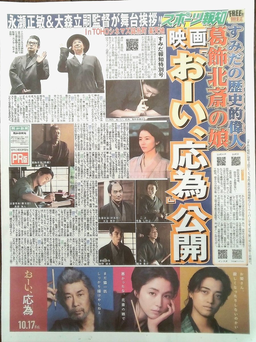すみだで生まれた江戸時代を代表する浮世絵師『葛飾北斎』の娘『応為 おうい』を描いた映画が公開されました。先日、永瀬正敏さんも『北斎美術館』にみえました。特集の新聞もございます。案内所にお越しください。(^-^)/ #葛飾北斎の娘 #映画おーい #北斎美術館 #北斎映画 #両国観光案内所 pic.x.com/XDmy9tmoXs