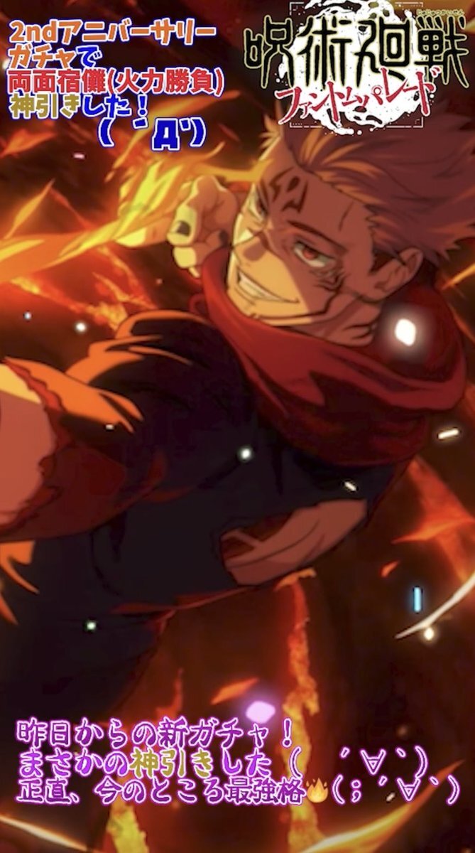 宿儺様…ツンデレですか??あんなすり抜けてたのに2連続なんて… 60連で2体獲得!!神引き!!そしてまじバカ強いわ💪w #ファンパレ2ndアニバーサリー #両面宿儺 pic.x.com/DT0c0sTQSu