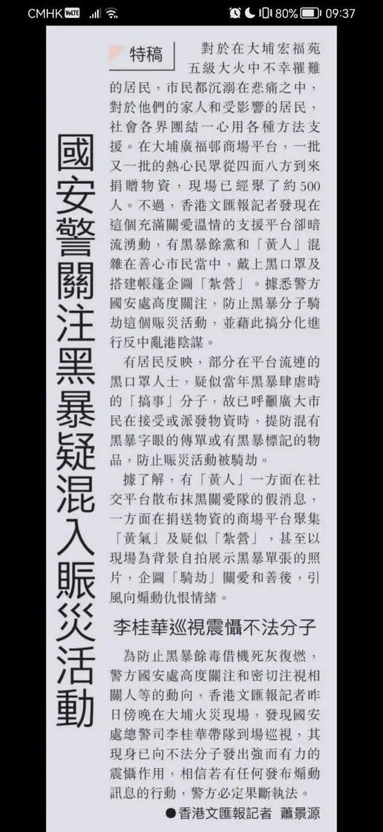親中メディアの文匯報は、「災害支援に黒暴(=民主派)が混入し、政治的扇動や混乱を狙っている可能性がある」 と何度も強調して、市民ボランティアを“暴力分子”のように扱う。 実際に最初から現場で支えていたのは市民。支援物資を集め、避難者を助け、混乱の中でも必死に動いていたのも市民。 x.com/hklemontea03/s…