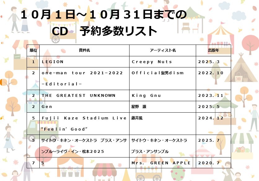 #ベスト予約⑤-1】#中央図書館 稲城市立図書館10月の予約多数ランキング! CD部門では、人気曲がおさめられた #CreepyNuts の待望のニューアルバムが堂々の一位に! DVD部門では、公開10周年となる二位の #インターステラー は期間限定でIMAX上映されているそうです! x.com/Inagilib/statu…