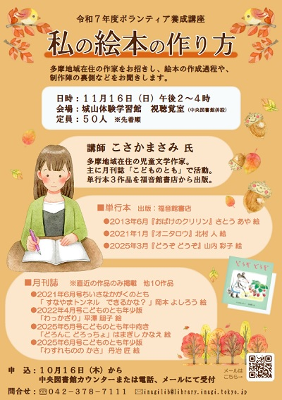 【イベント情報】#中央図書館 ボランティア養成講座「私の絵本の作り方」 作家の方をお招きし絵本の作成過程や 制作陣の裏側などをお聞きします。 日時:11月16日(日)午後2~4時 場所:城山体験学習館 視聴覚室 講師:こさかまさみ 氏 定員:先着50人 現在募集中! 詳細はHP・ポスターにて。