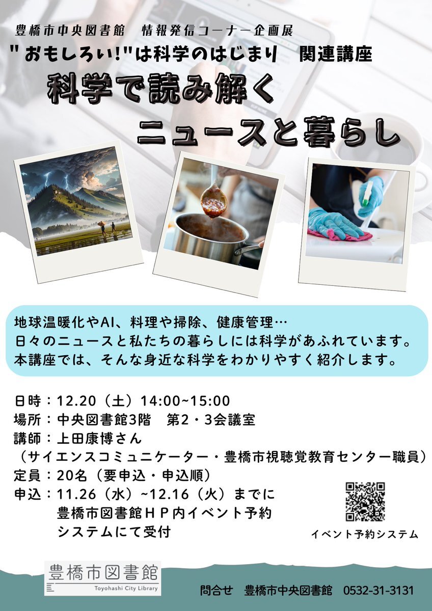 12月20日に、豊橋市中央図書館で「科学で読み解くニュースと暮らし」という講演をします〜! このタイトル通りの話ができるかどうかは当日までの準備次第ですが笑 申込始まっていますので、ご興味ある方はぜひ……↓↓↓ www2.library.toyohashi.aichi.jp/eventUser/main… #豊橋市 #中央図書館 #サイエンス pic.x.com/nGrGE73gfY