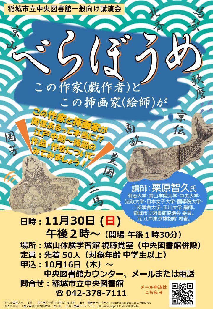 【イベント情報】#中央図書館 一般向け講演会がついに今週末30日(日)開催です! 歌麿、南畝、京伝、北斎などなど、 大河ドラマでも話題の戯作者や絵師たちについて 講師 栗原 智久氏にお話しいただきます。 ぜひご参加ください😀 x.com/Inagilib/statu…