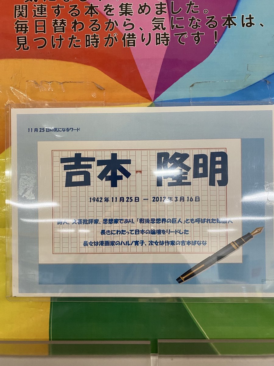 【毎日展示】#中央図書館 11月25日は詩人、文芸評論家、思想家であり、長きにわたって論壇をリードし「戦後思想界の巨人」とも呼ばれた #吉本隆明 の誕生日。 長女のハルノ宵子は漫画家、次女の吉本ばななは作家として活躍しています。 吉本隆明全集も所蔵があります。ご利用ください。 pic.x.com/qslv7CCDYX