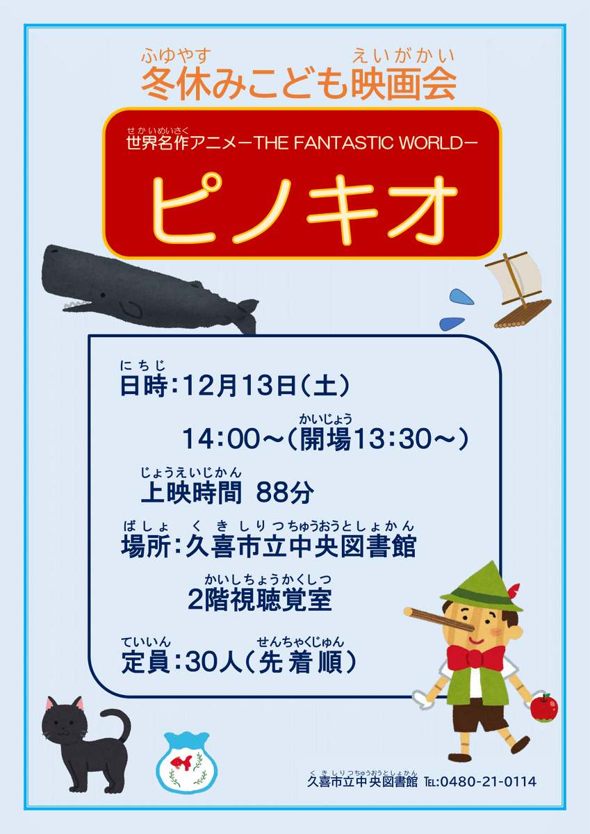 #中央図書館 冬休みこども映画会🎥】 日時:12月13日(土)14:00~ 「ピノキオ」 (1940年 アニメーション作品 88分)を上映します。 皆様のご来場、お待ちしています! 詳しくは、画像をご覧ください。 pic.x.com/SZWRpIyL1a