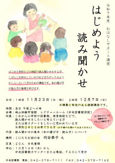 【イベント情報】#中央図書館 おはなしサポート講座「はじめよう読み聞かせ」 日時:11月23日(日・祝)    12月7日(日) 両日午後2~4時    ※連続講座です。 場所:城山体験学習館 レクチャールーム 講師:円谷恭子氏 定員:先着20人 現在募集中! 詳細はHP・ポスターにて。