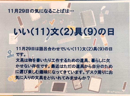 【毎日展示】#中央図書館 11月29日は語呂合わせで『いい(11)文(2)具(9)の日』です。 文具は物を書いたり工作するための道具、暮らしに欠かせない存在です。 最近はただの道具から自分が楽しむ趣味になってきています。デスク周りにお気に入りの文具をとりいれてみませんか? #いい文具の日 #文房具 pic.x.com/3lzcQ8MNvt