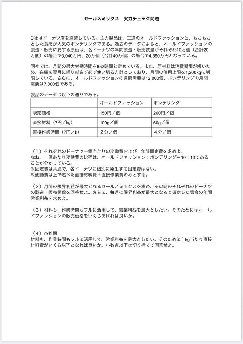 【挑戦者求む】 事例4のセールスミックス問題を作成しました 🕐目標時間 (3)までなら25分 (4)までなら40分 ※設問4は難問です。 本番前の力試しにどうぞ😉 #中小企業診断士二次試験 pic.x.com/RrCeU20OBj