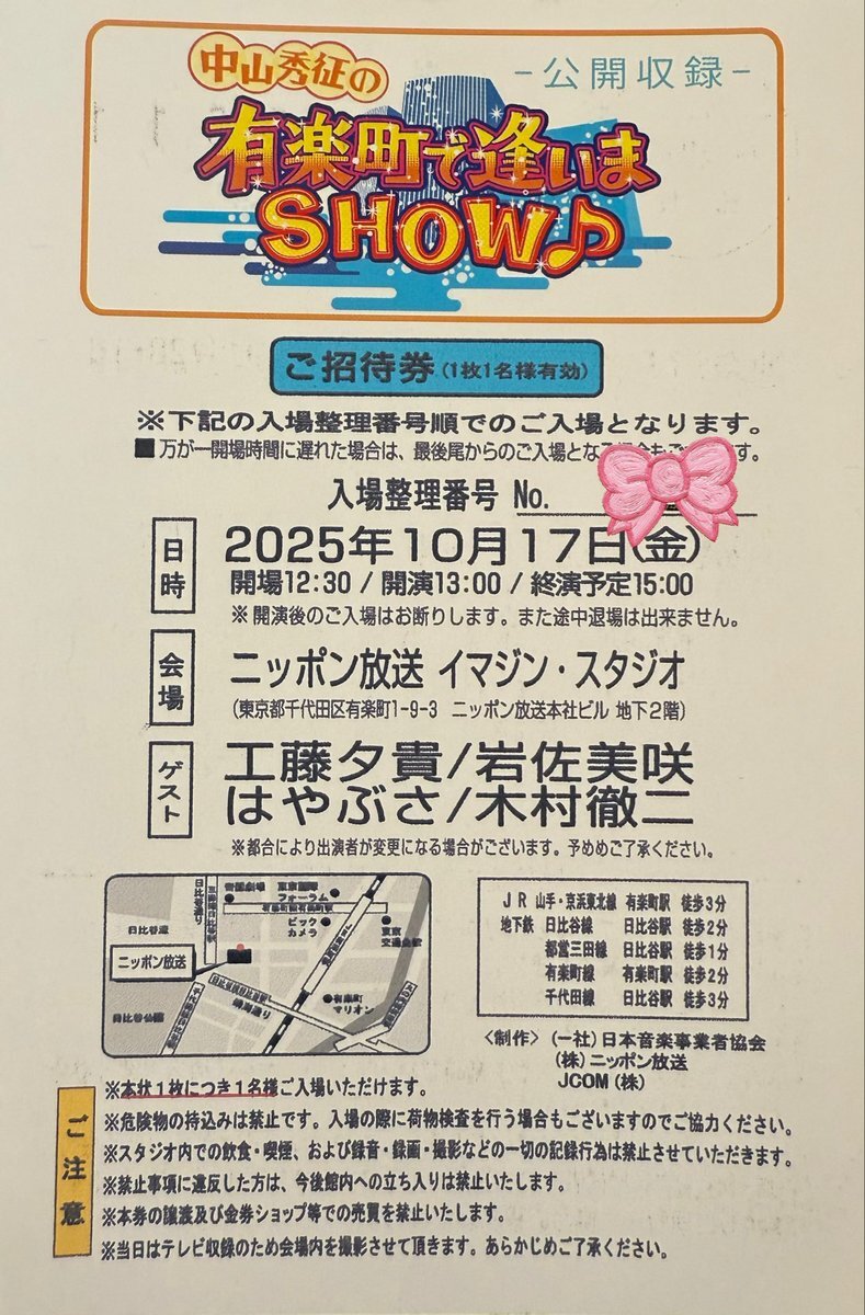 頑張ります✊出演者の中で1番でかいので 見つけやすいかと‼️🐽宜しくお願い致しますm(__)mご応募お待ちしております🫡 #中山秀征の有楽町で逢いまSHOW♪ 1242.com/hide/ #越川ゆう子 #望郷ひとり言 #じょんから未練