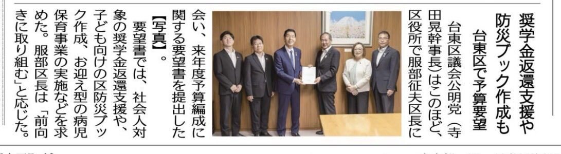 中沢ふみおです 本日付の公明新聞 東京・山梨版に先日行った予算要望書提出の記事を掲載されております 皆さまが喜んで頂けるまた安心して生活出来る政策実現に向けて取り組んで参ります #中沢ふみお #予算要望書 #台東区 pic.x.com/FhEp7WJlI8